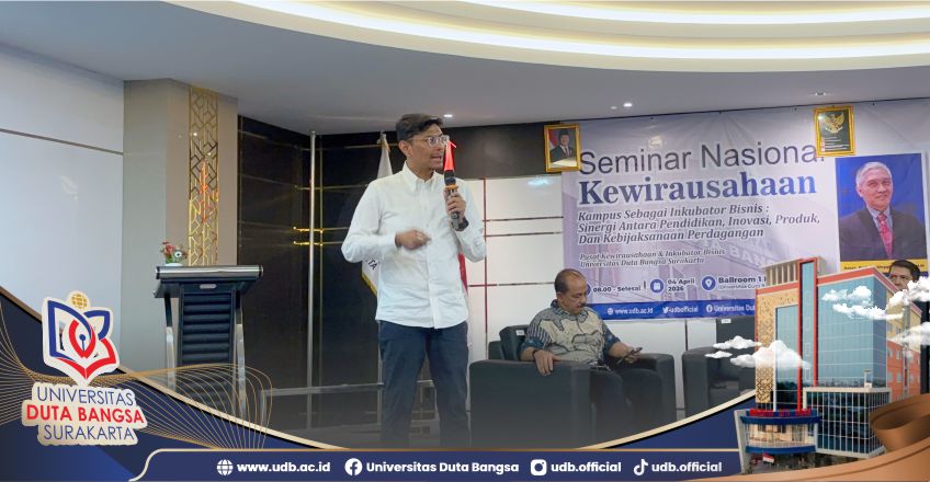 Pusat Kewirausahaan dan Inkubator Bisnis Universitas Duta Bangsa Surakarta sukses menyelenggarakan Seminar Nasional Kewirausahaan yang menghadirkan narasumber kompeten dari tingkat nasional hingga daerah. Kegiatan ini menjadi wadah strategis dalam mendorong penguatan jiwa kewirausahaan di kalangan akademisi, pelaku usaha, dan masyarakat umum. Seminar ini menghadirkan Iqbal S. Shofwan selaku Direktur Jenderal Perdagangan Dalam Negeri Kementerian Perdagangan Republik Indonesia, serta Iman Buhairi Santoso yang merupakan Ketua Paguyuban UMKM Solo. Turut hadir pula Singgih Purnomo sebagai tuan rumah sekaligus pembicara.