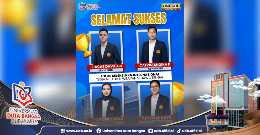 Universitas Duta Bangsa (UDB) Surakarta mencatatkan prestasi membanggakan melalui empat mahasiswanya yang berhasil lolos seleksi program Kuliah Kerja Nyata (KKN) Internasional bertajuk "Mangunsari Goes Abroad". Program bergengsi ini diselenggarakan oleh Lembaga Layanan Pendidikan Tinggi (LLDIKTI) Wilayah VI sebagai upaya memperluas kontribusi mahasiswa di kancah global. Keempat mahasiswa yang terpilih tersebut adalah Bagas Dava Aji Ramadhan, Calvin Andika Putra, Oktaviana Ayu Sekar Astuti, dan Sevy Septiana Afina.