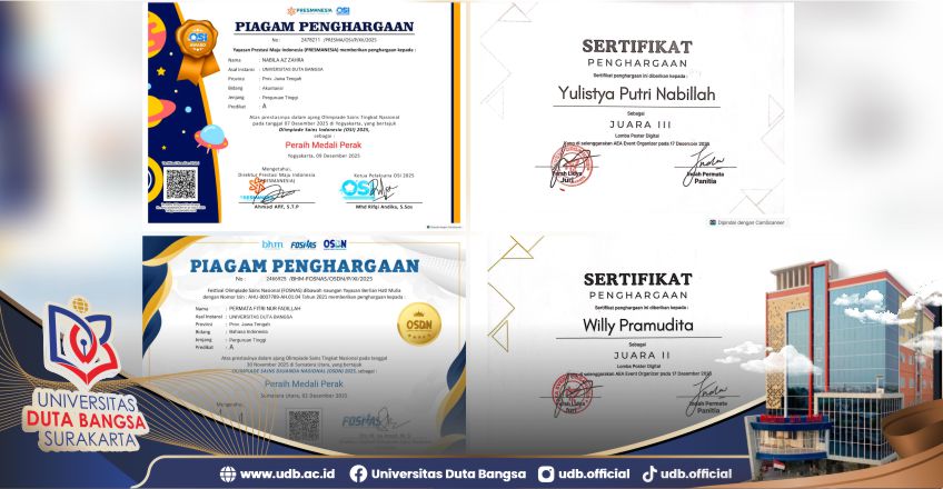 Prestasi ini menjadi bukti nyata kualitas pendidikan dan bimbingan di lingkungan UDB Surakarta. Berikut adalah daftar mahasiswa berprestasi tersebut: 1. Nabila Az Zahra: Meraih Medali Perak pada Olimpiade Sains Indonesia (OSI) bidang Akuntansi tingkat Mahasiswa; 2. Permata Fitri Nur Fadillah: Meraih Medali Perak pada Olimpiade Sains Djuanda Nasional (OSDN) bidang Bahasa Indonesia tingkat Mahasiswa; 3. Asti Agustin: Meraih Medali Perunggu pada Olimpiade Sains Djuanda Nasional (OSDN) bidang Akuntansi tingkat Mahasiswa; 4. Willy Pramudita: Meraih Juara 2 Lomba Poster Digital kategori Umum; 5. Yulistya Putri Nabillah: Meraih Juara 3 Lomba Poster Digital.