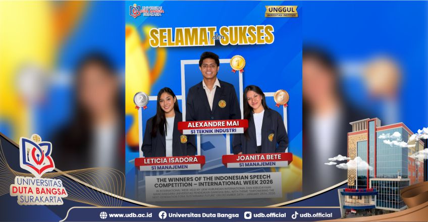 Universitas Duta Bangsa (UDB) Surakarta kembali menorehkan prestasi membanggakan di tingkat nasional. Dalam ajang Indonesian Speech Competition yang diselenggarakan oleh Universitas Pendidikan Ganesha (Undiksha), Bali, delegasi mahasiswa UDB berhasil mendominasi podium juara dengan menyapu bersih posisi pertama hingga ketiga. Pada kompetisi tersebut, Alexandre Mai Vinhas, mahasiswa Program Studi S1 Teknik Industri, tampil gemilang dan berhasil meraih Juara 1. Prestasi tersebut disusul oleh Leticia Isadora Dos Santos dari Program Studi S1 Manajemen yang meraih Juara 2, serta Joanita Bete Freitas, juga dari S1 Manajemen, yang menempati Juara 3.