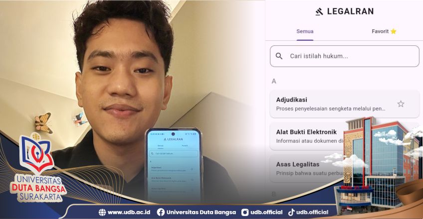 Universitas Duta Bangsa Surakarta kembali menorehkan prestasi membanggakan melalui inovasi mahasiswa Program Studi S1 Hukum. Randi Febrian, mahasiswa S1 Hukum Universitas Duta Bangsa Surakarta, berhasil menciptakan sebuah Kamus Hukum Digital berbasis aplikasi yang diberi nama LEGALRAN, di bawah bimbingan Kaprodi S1 Hukum, Dr. Aris Prio Agus Santoso, S.H., M.H. LEGALRAN merupakan akronim yang sarat makna. “Legal” merepresentasikan substansi hukum sebagai inti dari aplikasi, sementara “Ran” diambil dari nama penciptanya, Randi Febrian, sebagai identitas karya intelektual mahasiswa. Aplikasi ini dirancang sebagai kamus hukum digital yang memuat istilah-istilah hukum beserta penjelasan yang mudah dipahami, sehingga dapat digunakan oleh mahasiswa, akademisi, maupun masyarakat umum yang ingin memahami hukum secara praktis.
