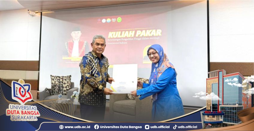 Rektor Universitas Duta Bangsa Surakarta, Assoc. Prof. Dr. Singgih Purnomo, M.M., dalam sambutannya menyampaikan bahwa kerja sama ini merupakan wujud komitmen UDB dalam memperkuat pelaksanaan Tri Dharma Perguruan Tinggi. Menurutnya, kolaborasi dengan Pengadilan Tinggi Yogyakarta memberikan ruang pembelajaran yang otentik bagi mahasiswa hukum melalui transfer pengetahuan langsung dari pimpinan lembaga peradilan. Melalui penandatanganan MoU dan Kuliah Pakar ini, UDB berharap dapat melahirkan lulusan hukum yang berkarakter, berintegritas, dan memiliki pemahaman komprehensif mengenai kewenangan serta peran strategis Pengadilan Tinggi dalam menjaga konsistensi hukum nasional.