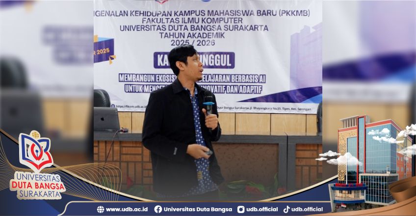 Fakultas Ilmu Komputer Universitas Duta Bangsa (UDB) Surakarta telah sukses menyelenggarakan kegiatan Pengenalan Kehidupan Kampus Mahasiswa Baru (PKKMB) Tahun Akademik 2025/2026. Acara berlangsung mulai tanggal 2 hingga 16 September 2025 dengan rangkaian kegiatan yang padat, inspiratif, serta melibatkan jajaran pimpinan universitas hingga praktisi industri. Kegiatan PKKMB tahun ini mengangkat tema “Membangun Ekosistem Pembelajaran Berbasis AI untuk Mencetak Generasi Inovatif dan Adaptif”. Tema tersebut sejalan dengan visi Fakultas Ilmu Komputer untuk menghadirkan atmosfer akademik yang berorientasi pada perkembangan teknologi terkini, khususnya kecerdasan buatan (Artificial Intelligence) yang dilaksanakan oleh 4 program studi (S1 Sistem Informasi, S1 Teknik Informatika, D3 Teknik Komputer dan D4 Teknologi Rekayasa Perangkat Lunak) di Fakultas Ilmu Komputer. Adapun jumlah peserta PKKMB Fakultas Ilmu Komputer adalah 291. Acara dibuka secara resmi dengan sambutan dari Eko Purwanto, M.Kom., Ph.D. yang menegaskan bahwa Fakultas Ilmu Komputer sangat mendukung penuh program PKKMB. Dalam sambutannya, beliau menyampaikan pentingnya kegiatan ini sebagai fondasi awal mahasiswa baru untuk mengenal lingkungan kampus, menanamkan semangat belajar, dan mempersiapkan diri menghadapi perkembangan teknologi yang pesat.